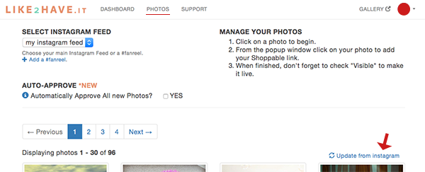 Like2Have.it pulls in new photos from your Instagram account every hour. If this isn't fast enough, no problem - Navigate to your PHOTOS section, there is an "Update from Instagram" link that will pull new photos immediately.